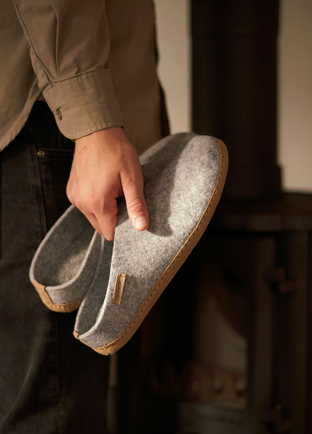 Våra fina tofflor tillverkade av italiensk ullfilt kommer med två olika typer av sulor: mocka eller gummi. Båda typerna av sulor är mycket bekväma. Här kan du ta reda på vilken typ av sula som passar dig bäst: