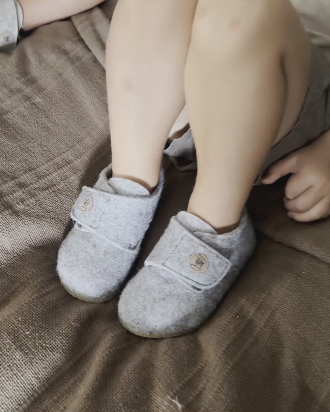 Ullfiltens naturliga egenskaper gör skorna både temperaturreglerande och fukttransporterande, så att de små fötterna förblir torra och varma hela dagen. Med eleganta läderdetaljer och en god passform erbjuder dessa tofflor en stilren och bekväm lösning för alla barns behov. När barnet har tofflorna på är dess fötter endast i kontakt med naturliga material, vilket ger både dig och ditt barn trygghet i att välja en miljövänlig och hållbar produkt.